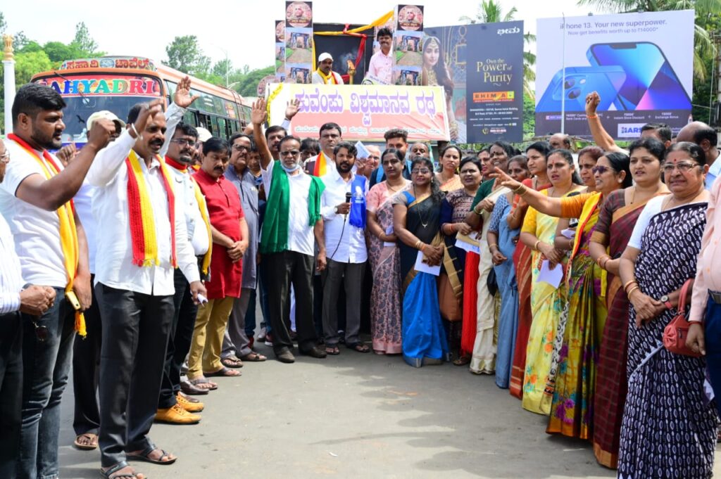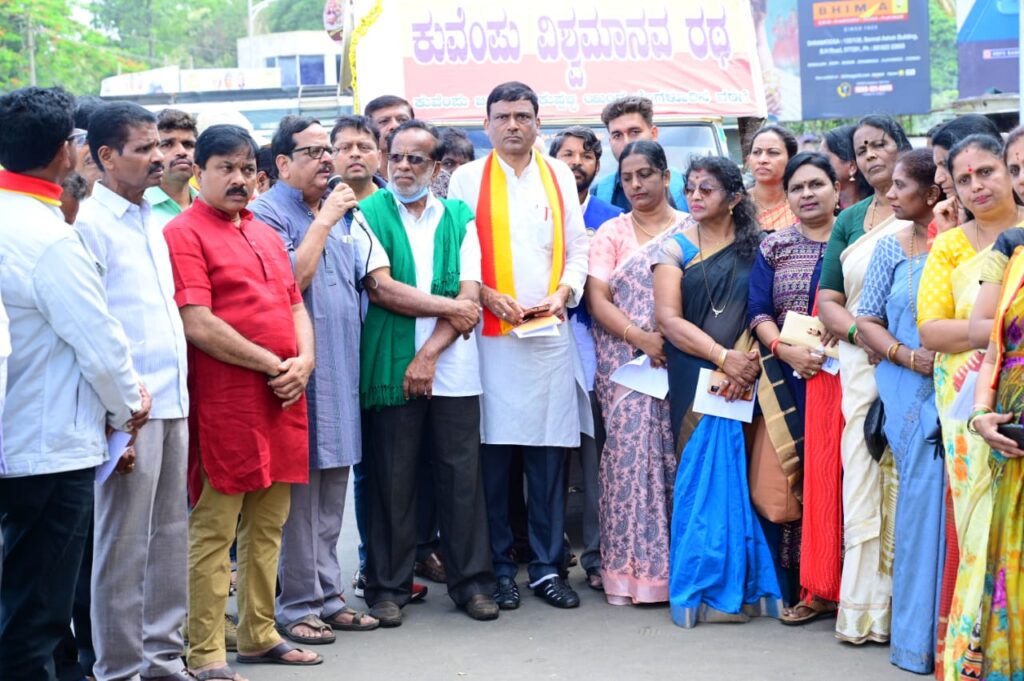 ನಗರದ ಕೆ. ಎಸ್. ಆರ್.ಟಿ.ಸಿ ಬಸ್ಸುನಿಲ್ದಾಣದ ಎದುರು ರಾಷ್ಟ್ರಕವಿ ಕುವೆಂಪು ಅವರ ಭಾವಚಿತ್ರಕ್ಕೆ ಮಾಲಾರ್ಪಣೆ ಮಾಡಿ ಸ್ವಾಗತಿಸಲಾಯಿತು. ಭಾಗವಹಿಸಿದ್ದ ಗಣ್ಯರು ಜಾಗೃತ ಜ್ಯೋತಿ, ಪ್ರತಿಭಟನೆ ಮಹತ್ವದ ವಿಚಾರವಾಗಿ ಮಾತನಾಡಿದರು.