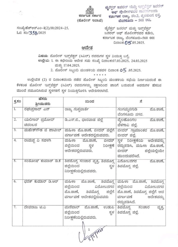 ಕರ್ನಾಟಕ ಸರ್ಕಾರ ರಾಜ್ಯದ ಹಲವು ಪೊಲೀಸ್ ಠಾಣೆಗಳ ಇನ್ಸ್ಪೆಕ್ಟರ್ ಗಳ ವರ್ಗಾವಣೆ ಮಾಡಿದ್ದು, ಕಳೆದ 10 ದಿನಗಳ ಹಿಂದೆ ನಡೆದಿದ್ದ ವರ್ಗಾವಣೆ ಆದೇಶವನ್ನು ರದ್ದುಪಡಿಸಿ ಹೊಸಬರನ್ನು ಈಗ ಪಿ ಐ ಪೋಸ್ಟ್ ಗೆ ವರ್ಗಾಯಿಸಿರುವುದು ವಿಶೇಷವೇ ಹೌದು.