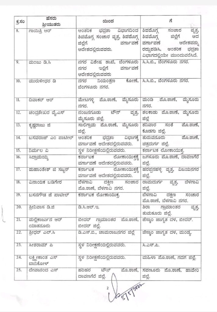 ಒಟ್ಟಾರೆ ಕಳೆದ ಹತ್ತು ದಿನಗಳ ಹಿಂದಿನ ಆದೇಶದಲ್ಲಿನ ಹಲವರ ವರ್ಗಾವಣೆ ರದ್ದಾಗಿದ್ದು, ಹಲವರು ಹಳೆಯ ಸ್ಥಾನದಲ್ಲಿ ಉಳಿದುಕೊಂಡಿದ್ದು ಸಂಚಾರಿ ವಿಭಾಗಕ್ಕೆ ದೇವರಾಜ್ ಹಾಗೂ ವಿನೋಬನಗರ ಠಾಣೆಗೆ ಸಂತೋಷ್ ಅವರನ್ನು ವರ್ಗಾಯಿಸಿದೆ.