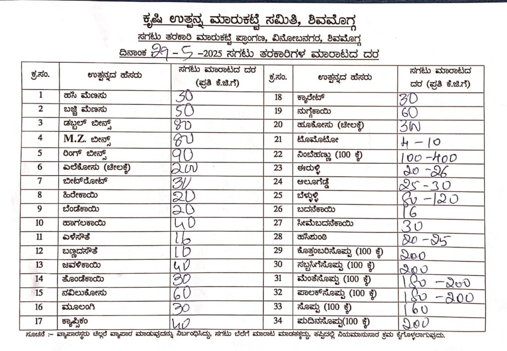 ಶಿವಮೊಗ್ಗ ಕೃಷಿ ಉತ್ಪನ್ನ ಮಾರುಕಟ್ಟೆ ಸಮಿತಿಯ ಆಶ್ರಯದಲ್ಲಿ ನಡೆಯುತ್ತಿರುವ ತರಕಾರಿಗಳ ಮಾರುಕಟ್ಟೆ ದರ ನಿತ್ಯ ನಿಗದಿಯಾಗಿದ್ದು ಅದಕ್ಕಿಂತ ಹೆಚ್ಚುವರಿಯಾಗಿ ವ್ಯಾಪಾರ ಮಾಡುವಂತಿಲ್ಲ. ಇದು ನಿಯಮ.