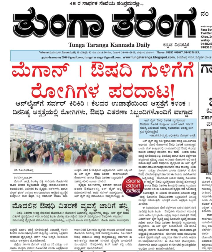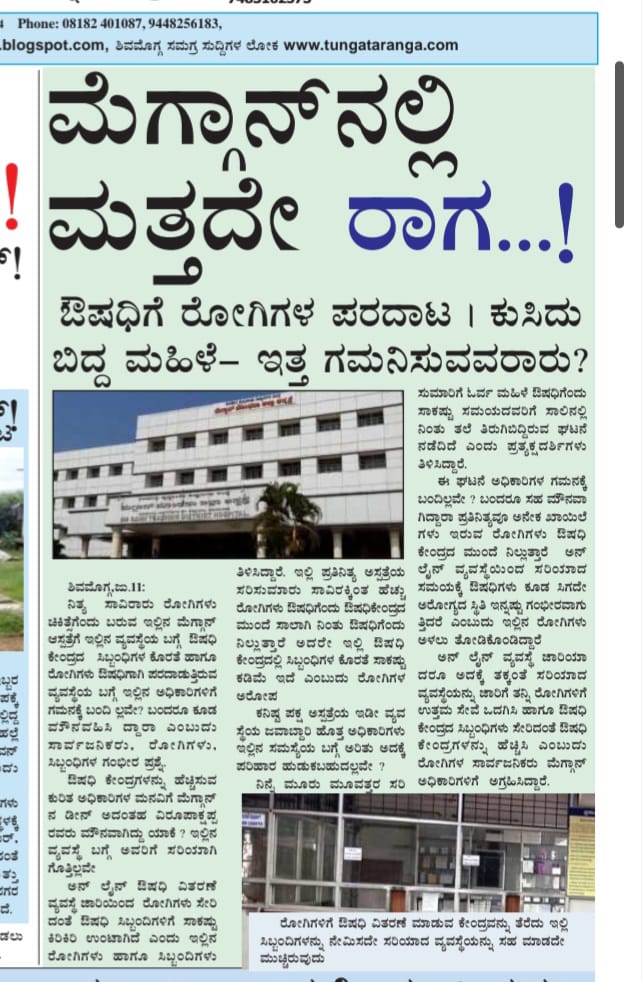 ಇಲ್ಲಿನ ವ್ಯವಸ್ಥೆಯನ್ನು ಗಮನಿಸಿದ ತುಂಗಾ ತರಂಗ ಪತ್ರಿಕೆ ಹಾಗೂ ವೆಬ್ ನ ಮೂಲಕ ರೋಗಿಗಳು ಔಷಧಿಗಾಗಿ ಪರದಾಡುತ್ತಿರುವುದನ್ನು, ಔಷಧಿ ಕೇಂದ್ರದ ಸಿಬ್ಬಂಧಿಗಳು ಅನುಭವಿಸುತ್ತಿದ್ದ ಸಾಕಷ್ಟು ಕಿರಿಕಿರಿ ಗಮನಿಸಿ ಕೂಡಲೇ ಔಷಧಿ ಕೇಂದ್ರಗಳನ್ನು ಇನಷ್ಟು ಹೆಚ್ಚಿಸಿ ಎಂದು