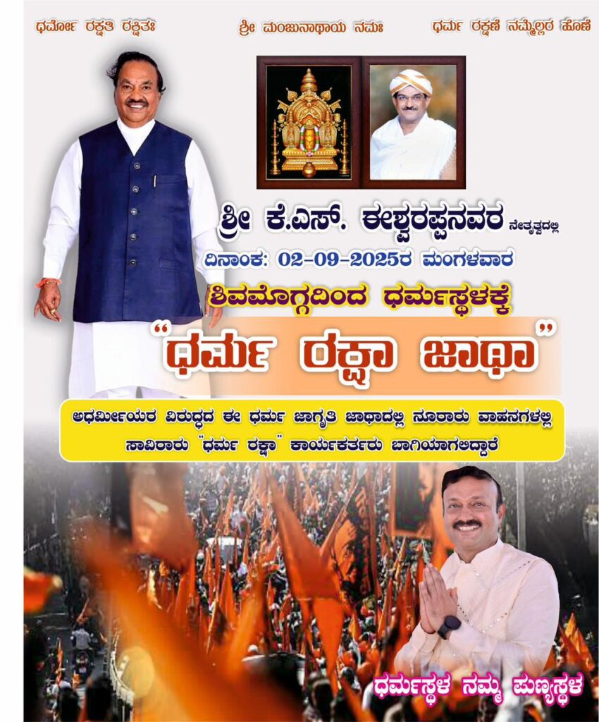 ಶಿವಮೊಗ್ಗದಿಂದ ಧರ್ಮಸ್ಥಳಕ್ಕೆ ಮಾಜಿ ಉಪಮುಖ್ಯಮಂತ್ರಿ, ಹಾಗೂ ರಾಷ್ಟ್ರಭಕ್ತ ಬಳಗದ ನಾಯಕರಾದ ಕೆ ಎಸ್ ಈಶ್ವರಪ್ಪ ಅವರ ನೇತೃತ್ವದಲ್ಲಿ ನಾಳೆ ಆಯೋಜಿಸಿರುವ ಧರ್ಮ ರಕ್ಷಾ ಜಾಥಕೆ ಈಗಾಗಲೇ 150ಕ್ಕೂ ಹೆಚ್ಚು ವಾಹನಗಳು ಸಿದ್ಧಗೊಂಡಿದ್ದು ಸುಮಾರು 700 ರಿಂದ 800 ರಾಷ್ಟ್ರ, ಧರ್ಮದ ಭಕ್ತರ ತಂಡ ಧರ್ಮಸ್ಥಳಕ್ಕೆ ಭೇಟಿ ನೀಡಲಿದೆ.