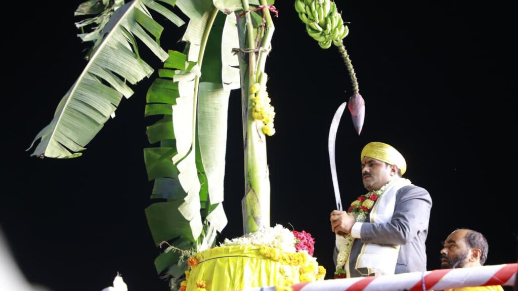 ನಗರದ ಕೋಟೆ ರಸ್ತೆಯ ಶ್ರೀ ಸೀತಾರಾಮಾಂಜನೇಯ ಸ್ವಾಮಿ ದೇವಾಲಯದ ಆವರಣದಲ್ಲಿ ಜಿಲ್ಲಾ ಉಸ್ತುವಾರಿ ಸಚಿವ ಮಧು ಬಂಗಾರಪ್ಪ ನಂದಿ ಧ್ವಜಕ್ಕೆ ಪೂಜೆ ಸಲ್ಲಿಸುವ ಮೂಲಕ ಚಾಮುಂಡೇಶ್ವರಿ ಮೂರ್ತಿಯ ವೈಭವದ ಜಂಬೂ ಸವಾರಿಗೆ ಚಾಲನೆ ನೀಡಿದರು.