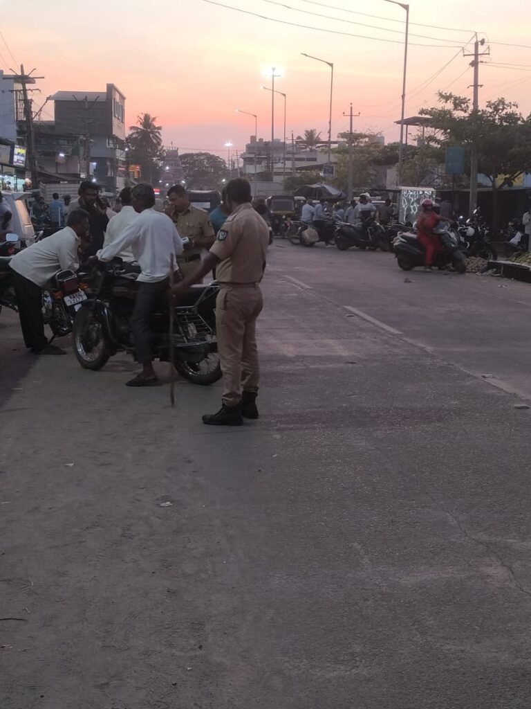 ಸಂತೆ ಮೈದಾನದಲ್ಲಿರುವ ಶಿವಾಜಿ ಸರ್ಕಲ್ ಪೋಲಿಸ್ ಠಾಣೆ ಉಪವಿಭಾಗದಿಂದ ದಿನಾಂಕ ನಿನ್ನೆ ಸಂಜೆ ಸುಮಾರು 6.30 ರಿಂದ ಪೋಲಿಸ್ ಅಧಿಕಾರಿ, (ಸಿಂಗಲ್ ಸ್ಟಾರ್ ಮತ್ತು ಡಬಲ್ ಸ್ಟಾರ್ ಅಧಿಕಾರಿಗಳು ಇಲ್ಲದೆ ಪೋಲಿಸ್) ಎಎಸ್ ಐ, ಪಿಎಸ್ಐ ಅಲ್ಲದವರು ಮತ್ತು ಸಿಬ್ಬಂದಿ ಮತ್ತು ಹೋಂ ಗಾರ್ಡ್ ನಿಂದ ವಾಹನಗಳನ್ನು ತಡೆದು ತಪಾಸಣೆ ಮಾಡುತ್ತಿದ್ದು, ಮತ್ತು ದಂಡ ಹಾಕುತ್ತಿದ್ದು ಕಂಡು ಬಂತು.