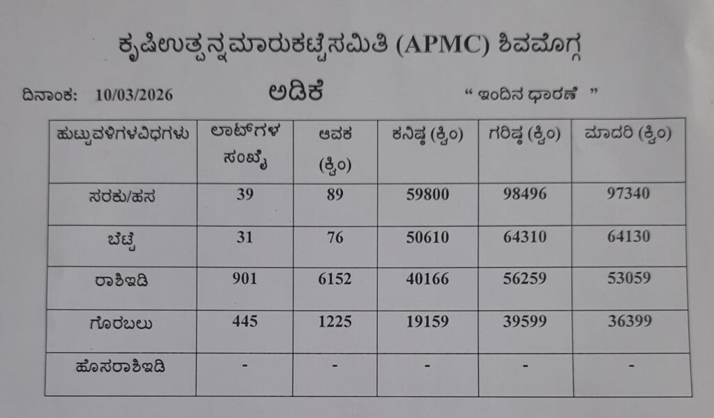 ಶಿವಮೊಗ್ಗ ಕೃಷಿ ಮಾರುಕಟ್ಟೆ ಉತ್ಪನ್ನ ಸಮಿತಿ (APMC) ಇಂದು ಬಿಡುಗಡೆ ಮಾಡಿದ ಅಡಿಕೆ, ತರಕಾರಿ, ಹುಣಸೇಹಣ್ಣು ಹಾಗೂ ಒಣ ಮೆಣಸಿನ ಕಾಯಿಯ ದರ ಅವಲೋಕಿಸಿದಾಗ ಎಲ್ಲವೂ ಏರಿಳಿತ ಆಗಿರುವುದು ಕಂಡುಬರುತ್ತದೆ.