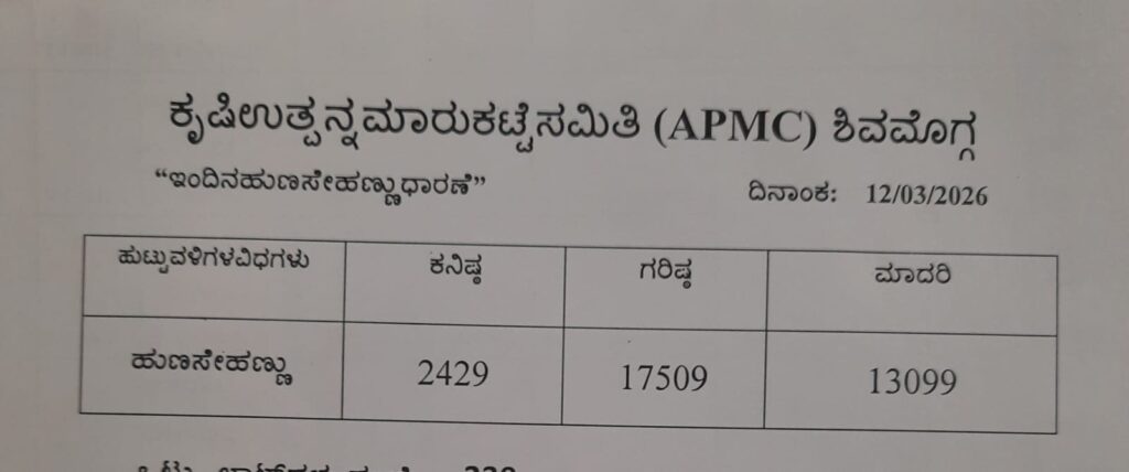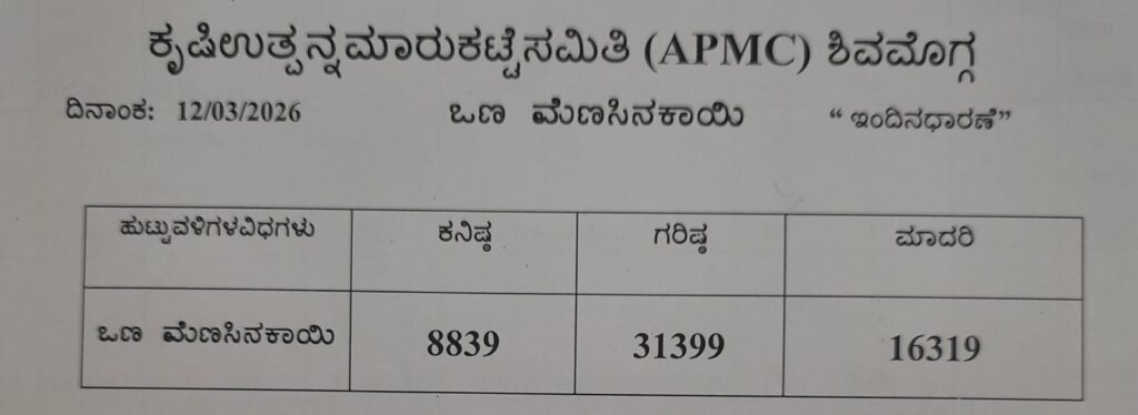 ಶಿವಮೊಗ್ಗ ಕೃಷಿ ಮಾರುಕಟ್ಟೆ ಉತ್ಪನ್ನ ಸಮಿತಿ (APMC) ಇಂದು ಬಿಡುಗಡೆ ಮಾಡಿದ ಅಡಿಕೆ, ತರಕಾರಿ, ಹುಣಸೇಹಣ್ಣು ಹಾಗೂ ಒಣ ಮೆಣಸಿನ ಕಾಯಿಯ ದರ ಅವಲೋಕಿಸಿದಾಗ ಎಲ್ಲವೂ ಕಡಿಮೆಯಾಗಿರುವುದು ಕಂಡುಬರುತ್ತದೆ.
