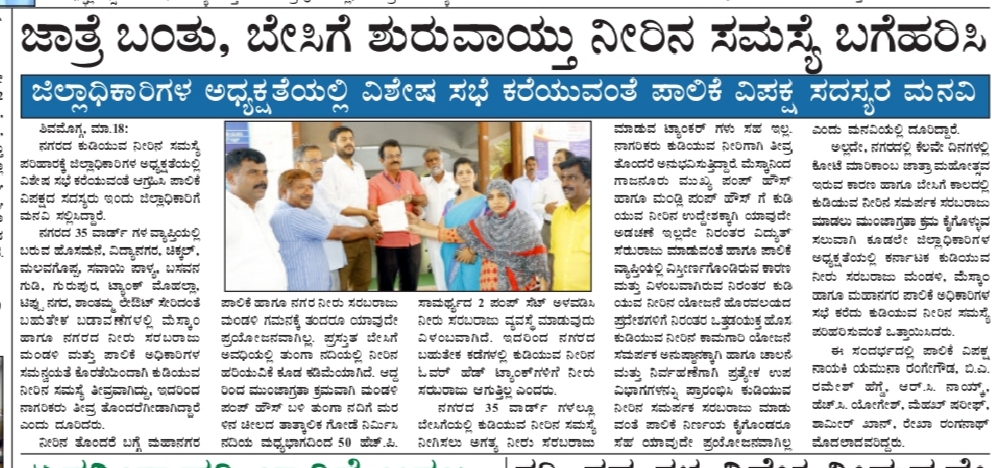 ಶಿವಮೊಗ್ಗ ನಗರ ನೀರು ಸರಬರಾಜು ಮತ್ತು ಒಳಚರಂಡಿ ಮಂಡಳಿ ನಿರ್ವಹಣಾ ವಿಭಾಗ ಮತ್ತು ಉಪವಿಭಾಗವು ದಿ: 20/03/2021 ರ ಭಾನುವಾರದಂದು 2021-22 ನೇ ಸಾಲಿನ ನೀರಿನ ಕಂದಾಯ ಮತ್ತು ಬಾಕಿ ಕಂದಾಯ ವಸೂಲಾತಿಗಾಗಿ “ಆರ್.ಎಂ.ಎಲ್.ನಗರ ಭಾರತೀಯ ಸಭಾಭವನದ ಎದುರು, ಸರ್ಕಾರಿ ಹಿರಿಯ ಪ್ರಾಥಮಿಕ ಶಾಲೆ ಆವರಣ ದ್ರೌಪದಮ್ಮ ವೃತ್ತ, ದೈವಜ್ಞ ಕಲ್ಯಾಣ ಮಂದಿರ ಜೈಲ್ ಸರ್ಕಲ್, ಪೊಲೀಸ್ ಚೌಕಿ ಸರ್ಕಲ್ ವಿನೋಬನಗರ, ಆರ್.ಎಂ.ಎಲ್.ಸರ್ಕಲ್ ಡಬ್ಬಲ್ ಟ್ಯಾಂಕ್ ಹತ್ತಿರ, ವಿದ್ಯಾಣಗರ ಮುಖ್ಯರಸ್ತೆ” ಗಳಲ್ಲಿ ವಿಶೇಷ ನೀರಿನ ಕಂದಾಯ ವಸೂಲಾತಿ ಕೌಂಟರ್ಗಳನ್ನು ತೆರೆಯಲಾಗಿದೆ.